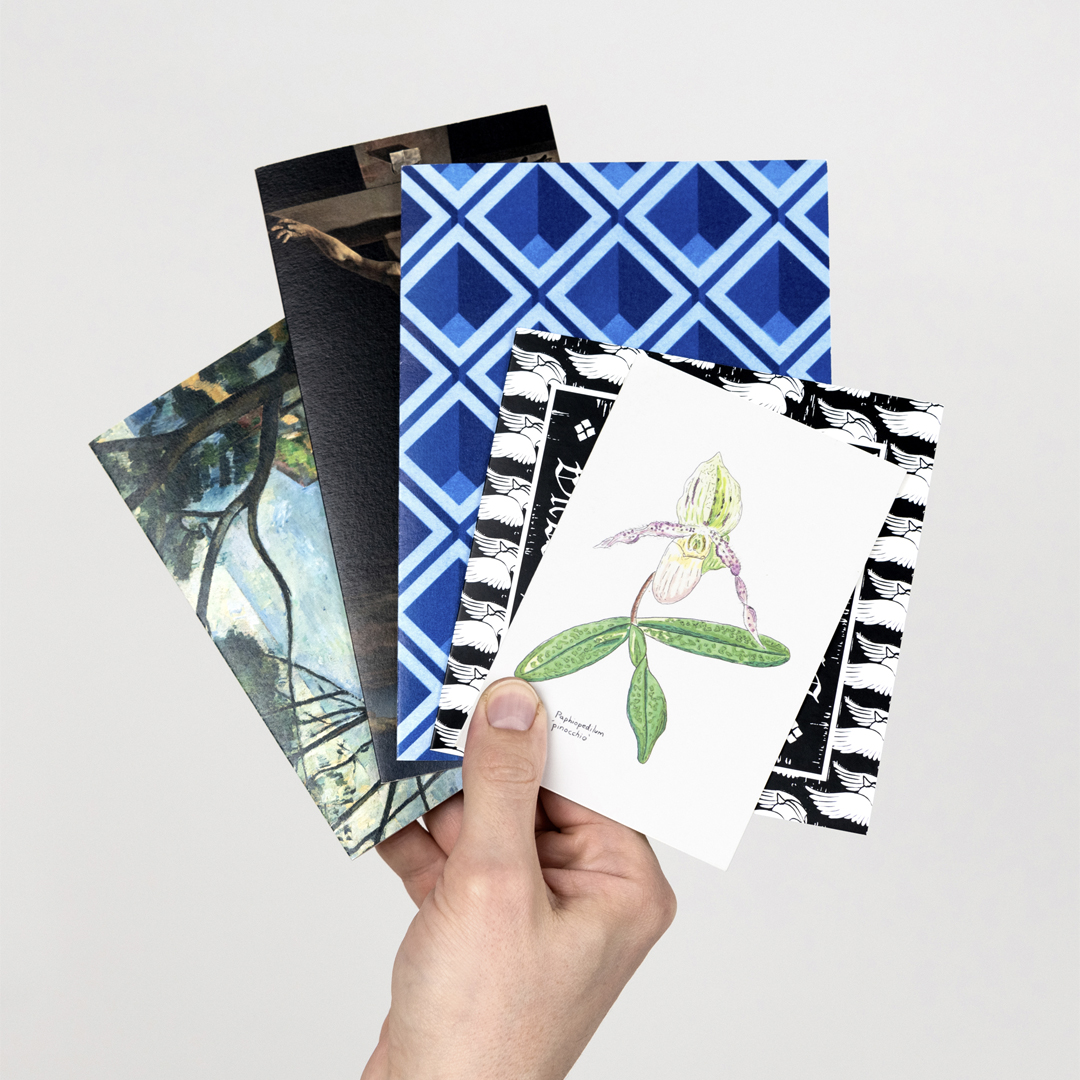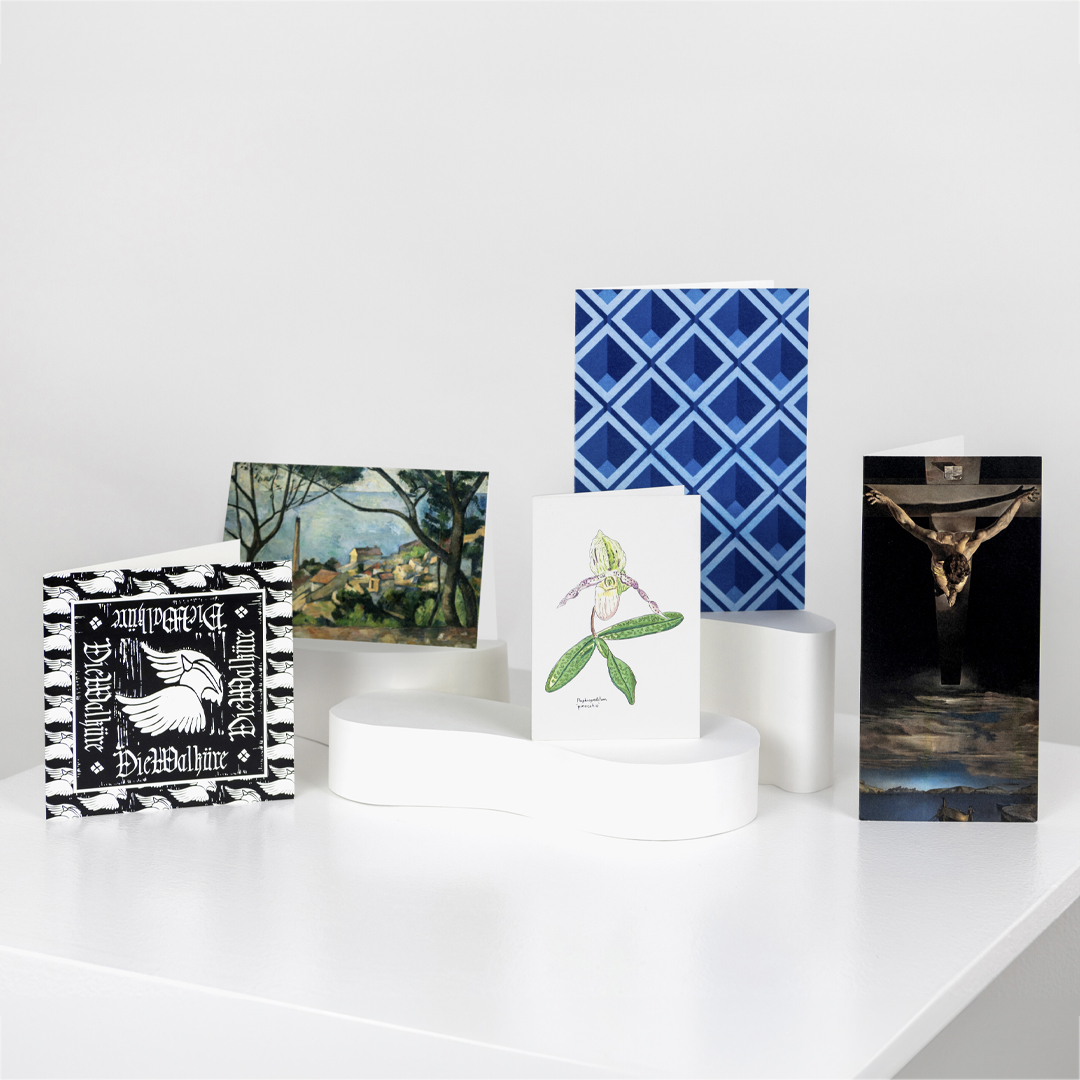 Individual greetings cards can be fastened with sustainable paper belly bands or packaged in cello bags. White envelopes are included.